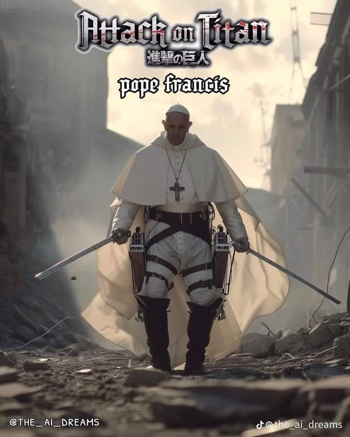 Queste immagini hanno spinto altri ancora a mettere indosso a Francesco abiti ancora più popolari: felpe, tute, scarpe da ginnastica, come un qualunque papà che porta i figli al parco. O a piazzarlo all’interno di noti scenari di fantasia come quelli dei comics o gli anime.