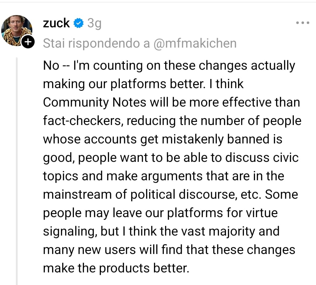 Ora non prendiamoci in giro: la moderazione è il fack checking sule piattaforme Meta erano già de facto assenti da tempo, con una proliferazione di gruppi d’odio e disinformazione che negli ultimi due anni era stata esponenzialei insieme, ovviamente, a una completa inutilità del sistema di segnalazioni è alla pressoché assenza di moderazione. Ma una cosa è un sistema che funziona male, un’altra è questa dichiarazione di intenti esplicita, così squisitamente politica anche nella forma, che questo sistema lo rimuove completamente.